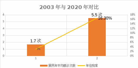 再次,据中国卫生事业发展情况统计公报显示,2003年,居民年平均就诊次数为1.7次,年住院率为3.0%,全国医疗机构入院人数6092万人,居民个人卫生支出3316.5亿元。到2020年,居民年平均就诊次数增加到5.5次,年住院率增加到16.3%,全国医疗卫生机构入院人数23013万人,个人卫生支出20055亿元。总体的就医人次和需要报销的人次均大大增加,对医保报销资金的需求自然也随之增加。
