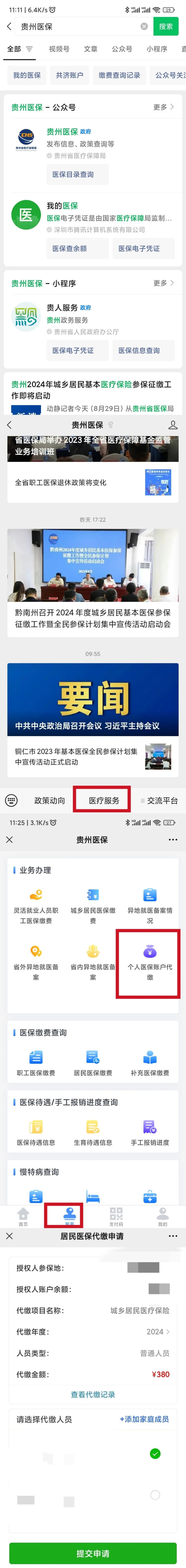 贵州职工医保参保人员的个人账户资金,既可以为家人支付就医发生的费用,也可以为家人代缴本省居民医保费,实现“一个人的钱,全家用”。在2024年集中征缴时间内,我们来谈如何代缴居民医保费,主要通过贵州医保微信公众号和贵州医保APP实现。